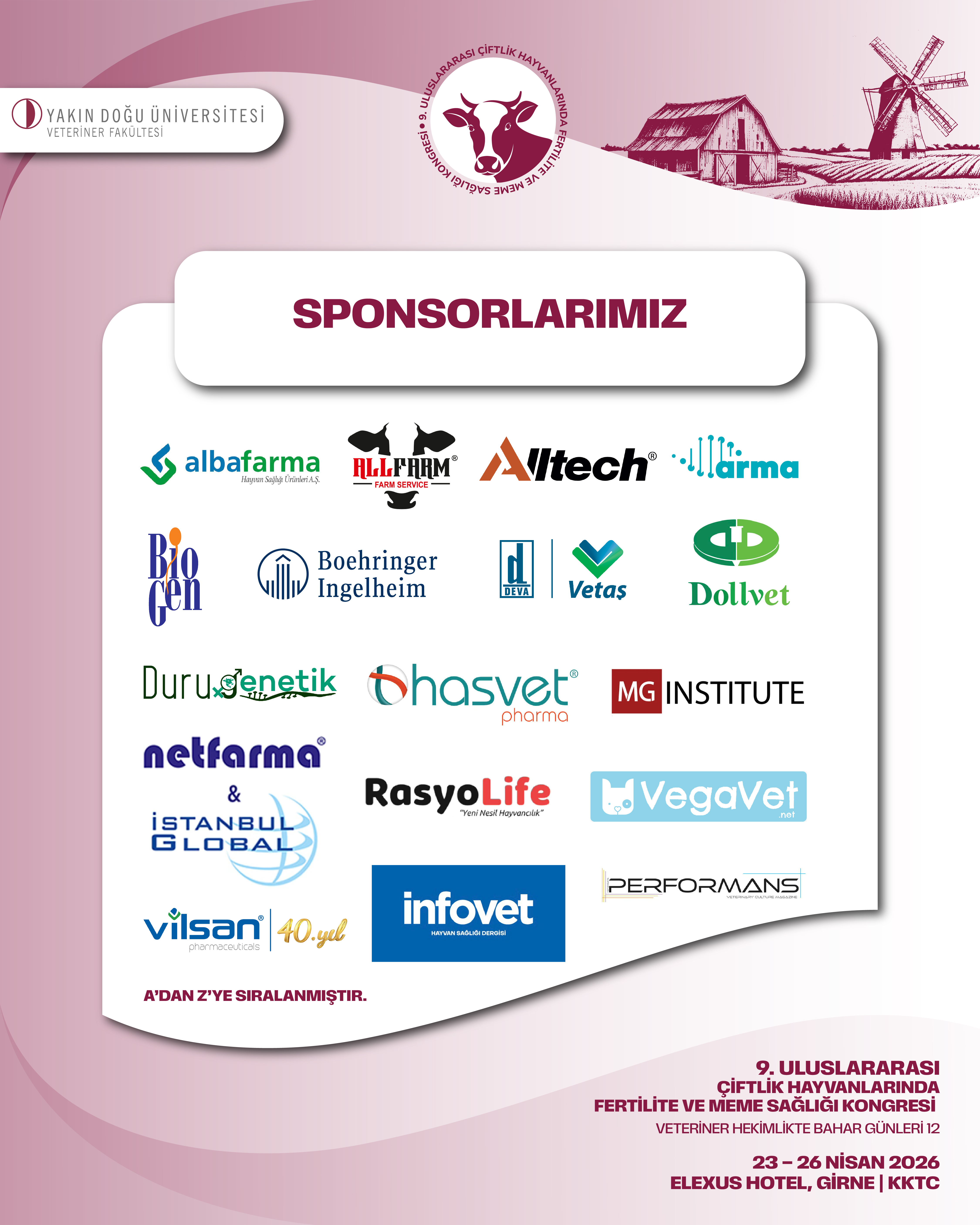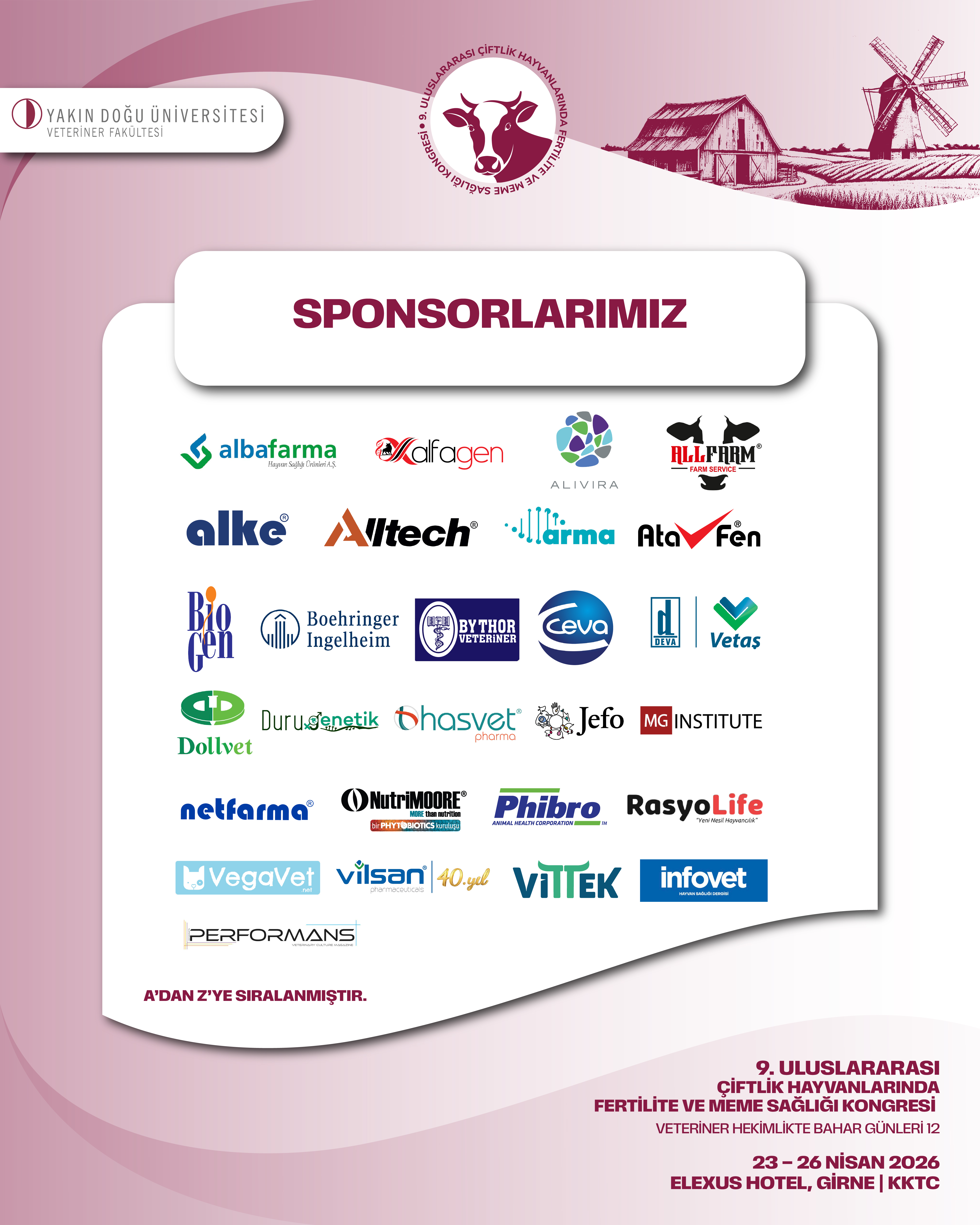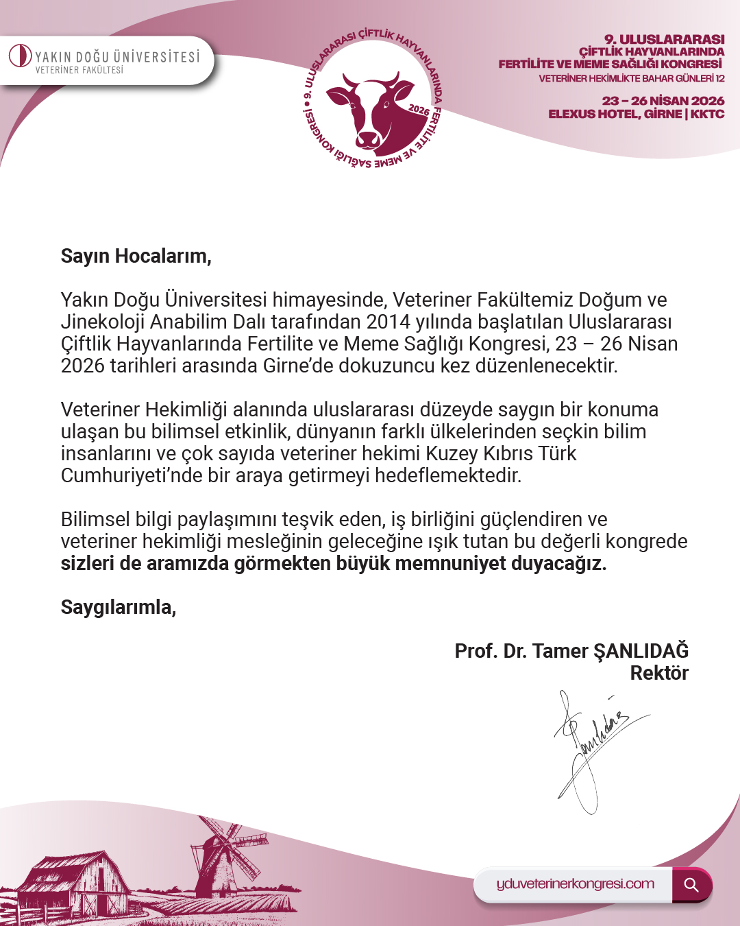 Yakın Doğu Üniversitesi Veteriner Fakültesi Doğum ve Jinekoloji Anabilim Dalı olarak, 2014 yılında Prof. Dr. Selim ASLAN başkanlığında başlattığımız ve artık gelenekselleşen Veteriner Hekimlikte Bahar Günleri kapsamında düzenlediğimiz Uluslararası Çiftlik Hayvanlarında Fertilite ve Meme Sağlığı Kongresi’nin dokuzuncusunu, Kıbrıs adasının en güzel mevsiminde, 23–26 Nisan 2026 tarihleri arasında turizmin gözde merkezi Girne’de gerçekleştirecek olmanın heyecanını ve mutluluğunu yaşıyoruz.